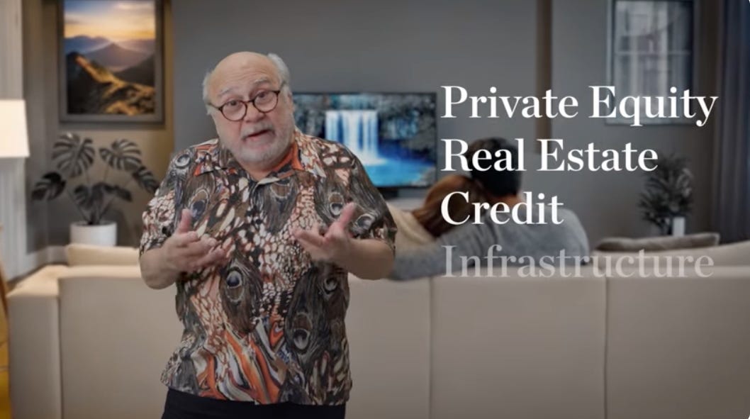 The second video is Blackstone’s 2025 holiday video, which is intended to be humorous. Midway through is a mock Blackstone commercial featuring “Jersey Mike’s” pitchman Danny DeVito saying, “Are you sick and tired of the volatility and lack of diversification associated with the public markets? Of course you are…Blackstone may have the nonlisted, semiliquid institutional-quality perpetual products you’ve been looking for,” DeVito says, wearing a Blackstone bucket hat as the words “Private Equity, Real Estate, Credit, Infrastructure” show on-screen.