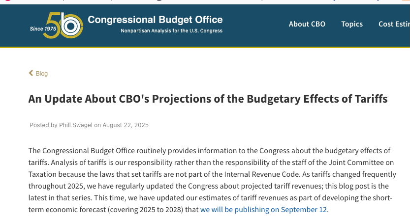 Back on June 4, when Congress was debating the One Big Beautiful Bill amid hotly contested estimates of its fiscal impact (see, “How ‘Big’ Is the One Big Beautiful Bill?” May 30, 2025), the CBO estimated the effect of the tariffs at a “$2.5 trillion decrease in primary deficits and $0.5 trillion reduction in interest outlays.” Now that it’s mid-August, about 10 weeks later, CBO has a revised estimate: “We project that increases in tariffs implemented during the period from January 6, 2025, to August 19 will decrease primary deficits (which exclude net outlays for interest) by $3.3 trillion if the higher tariffs persist for the 2025‒2035 period. By reducing the need for federal borrowing, those tariff collections will also reduce federal outlays for interest by an additional $0.7 trillion. As a result, the changes in tariffs will reduce total deficits by $4.0 trillion altogether.”