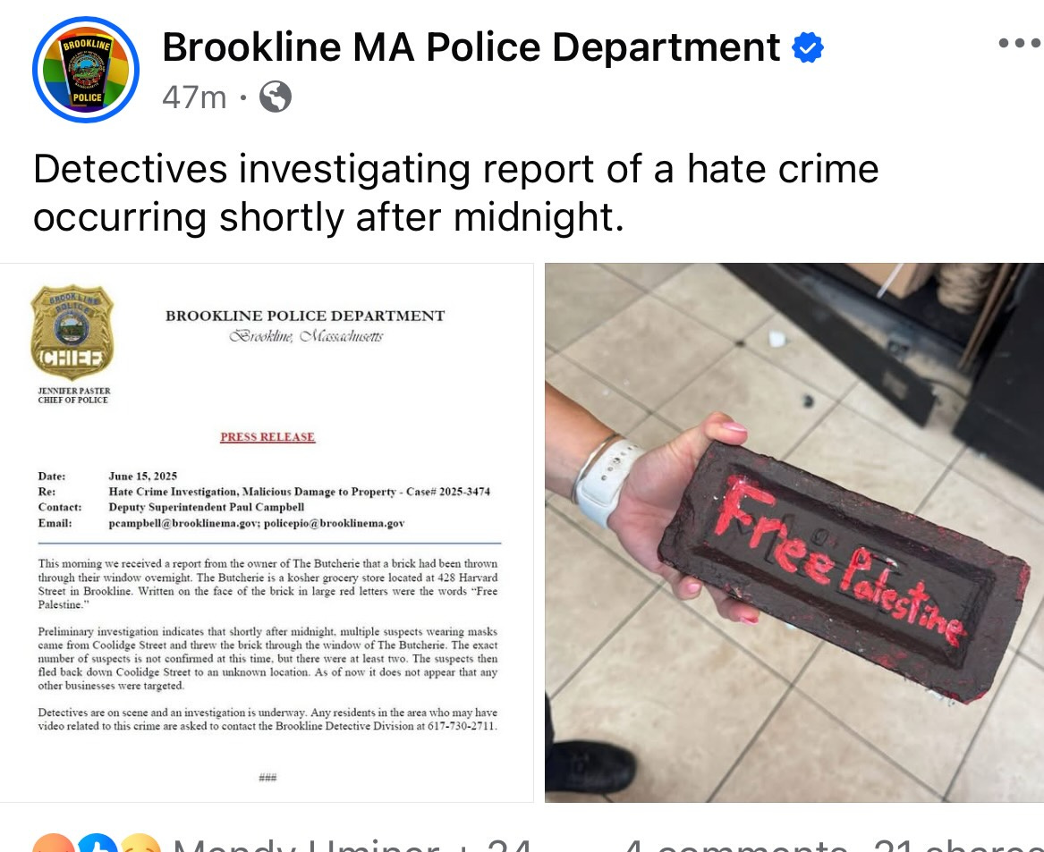 The chief of police in Brookline, Mass., the Boston suburb where the crime happened, put out a statement: “I am deeply saddened and outraged to report a disturbing act of hate and antisemitic vandalism that occurred overnight here in Brookline. A brick was thrown through the window of The Butcherie, a beloved kosher grocery store located on Harvard Street in Coolidge Corner. Written in large red letters across the face of the brick were the words ‘Free Palestine.’”