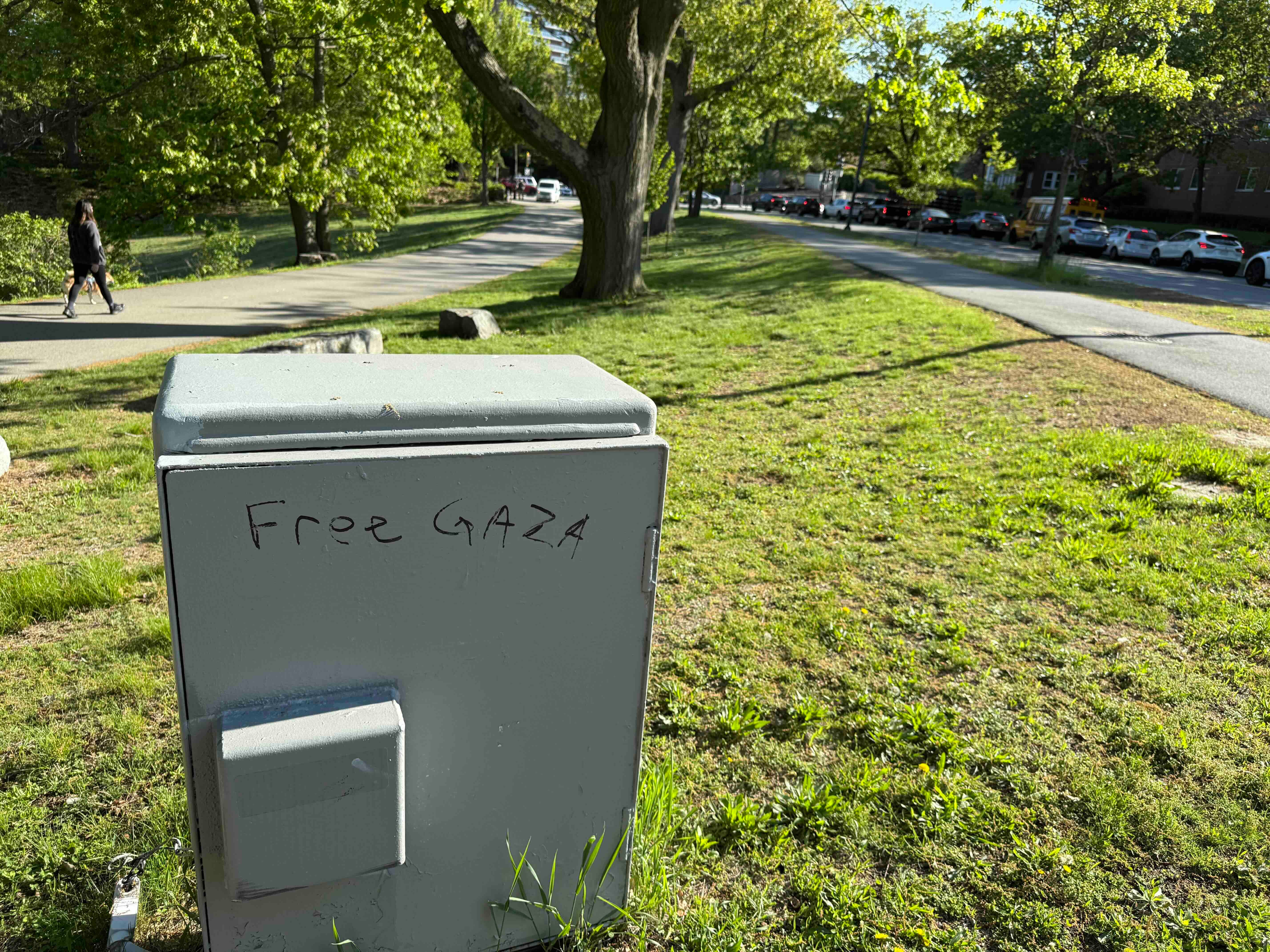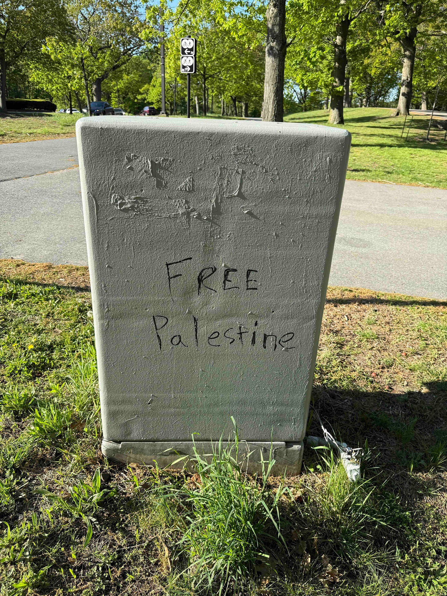 I’m no handwriting expert, but the handwritten “free palestine” letters on the Butcherie brick also reminded me of vandalism that I encountered, and took pictures of, in Boston’s Emerald Necklace parks on the morning of May 12.