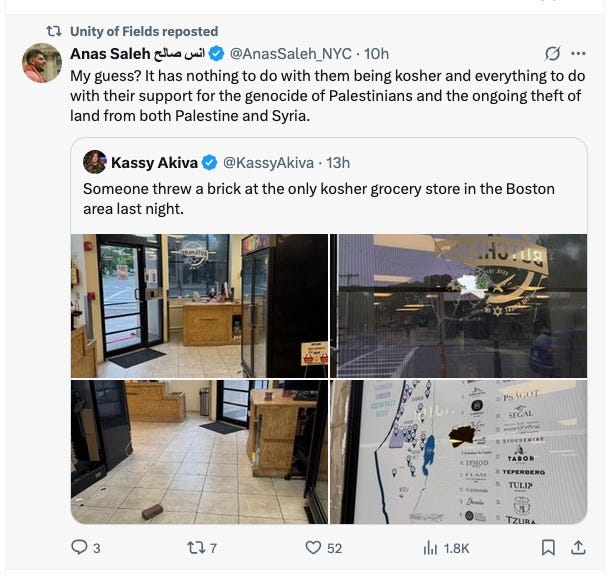 Plus: who threw the “free Palestine” brick through the window of a Boston kosher market?