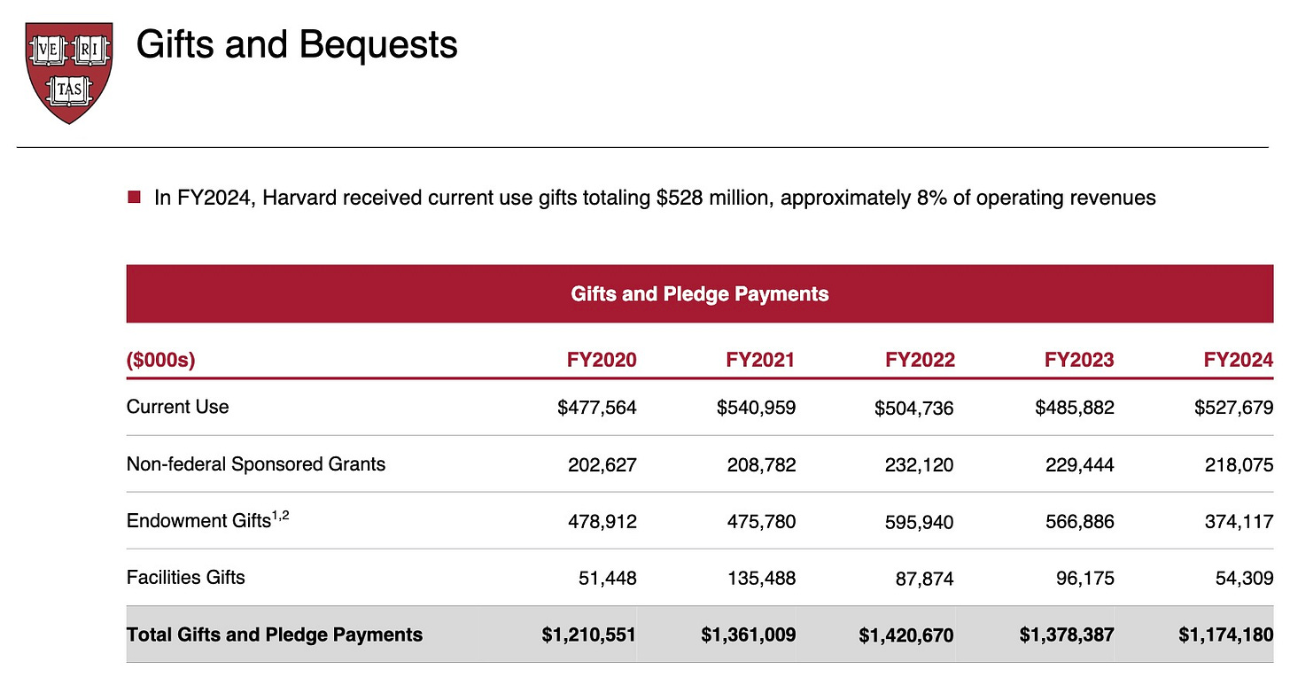 It shows Harvard’s total “gift and pledge payments” down to $1.17 billion in fiscal 2024 from $1.38 billion in fiscal 2023, a decline of $204,207,000. Maybe donors are deciding against handing money to Harvard so that Harvard can then invest it in hedge funds and private equity. Can you blame them?