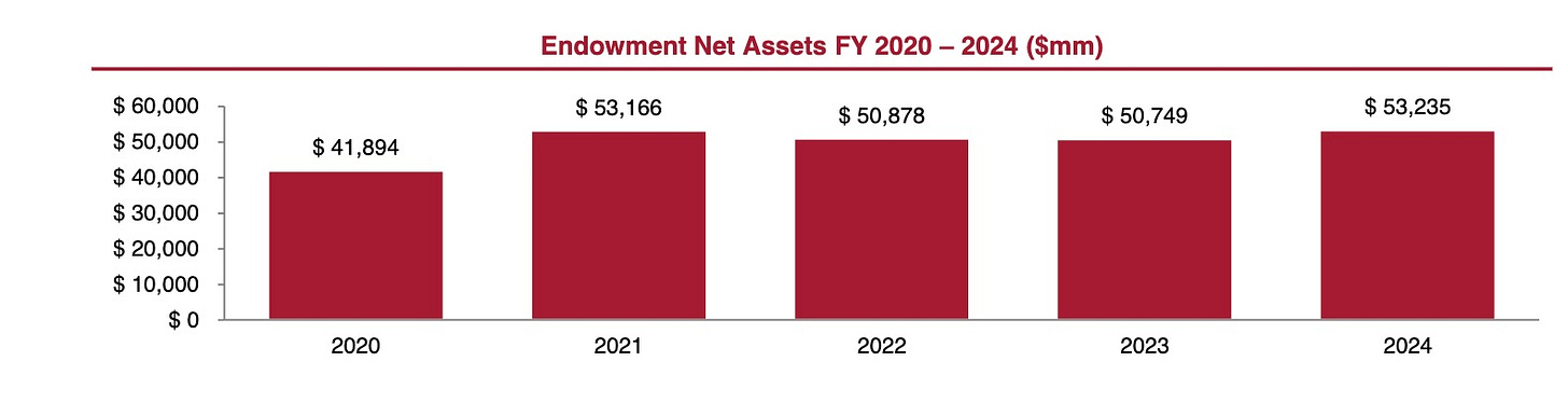 The borrower is Harvard, so the investment isn’t just to grow the principal but also to generate income for use to support research and teaching. Yet the four years from 2021 to 2024 look pretty flat during a stretch that for the S&P 500 showed healthy growth. Plenty of personal retirement accounts have done better than Harvard’s endowment during this period, including those managed by people who are not anyone’s idea of Warren Buffett. For the year ended June 30, 2024, Harvard reported a 9.6 percent annual return and the S&P 500 was up 24.6 percent. Janet Lorin at Bloomberg has been all over the Harvard endowment’s underperformance, and for good reason.