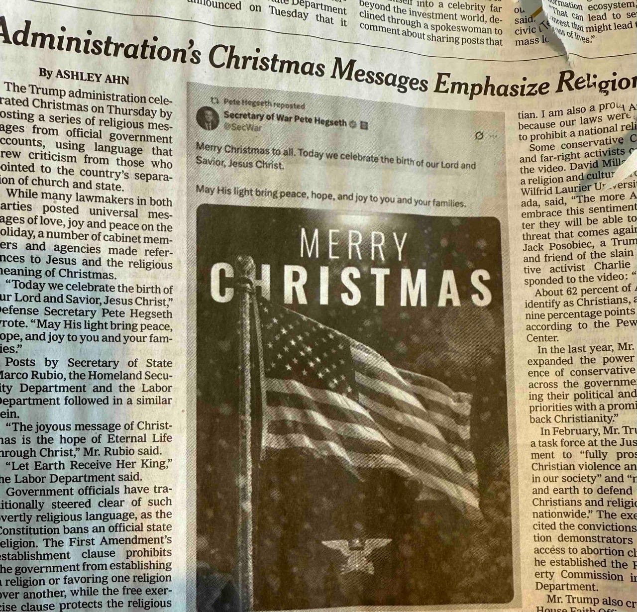 The first example has to do with Christmas. A Times news article by Ashley Ahn, a 2022 graduate of the University of Pennsylvania, reported that “The Trump administration celebrated Christmas on Thursday by posting a series of religious messages from official government accounts, using language that drew criticism from those who pointed to the country’s separation of church and state.”