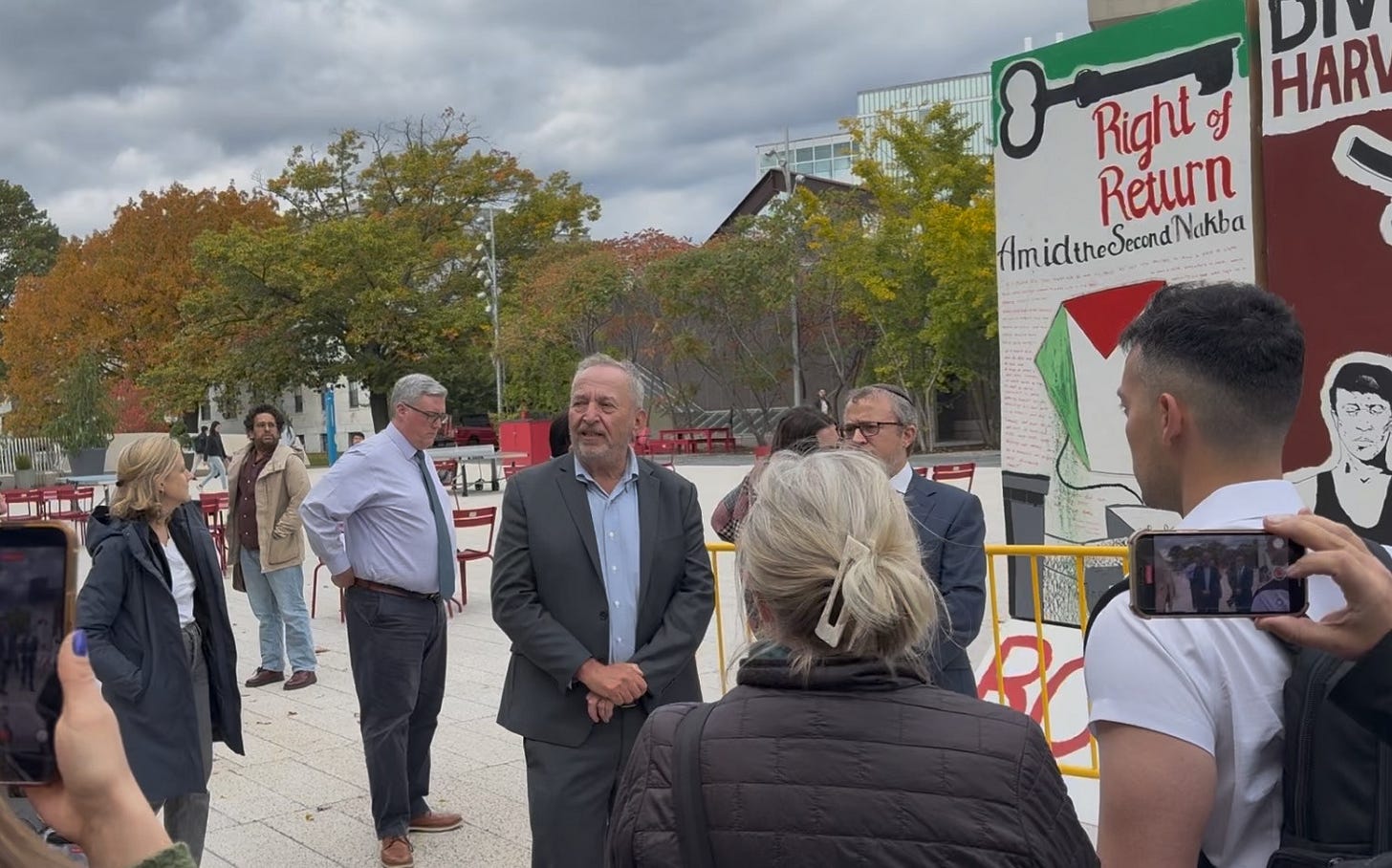 At that juncture—ironically, because Summers was speaking about free speech—Dean Claybaugh emerged from behind the large lie-filled anti-Israel structure accompanied by the dean of students at Harvard College, Thomas Dunne, and leaders of the Palestine Solidarity Committee.