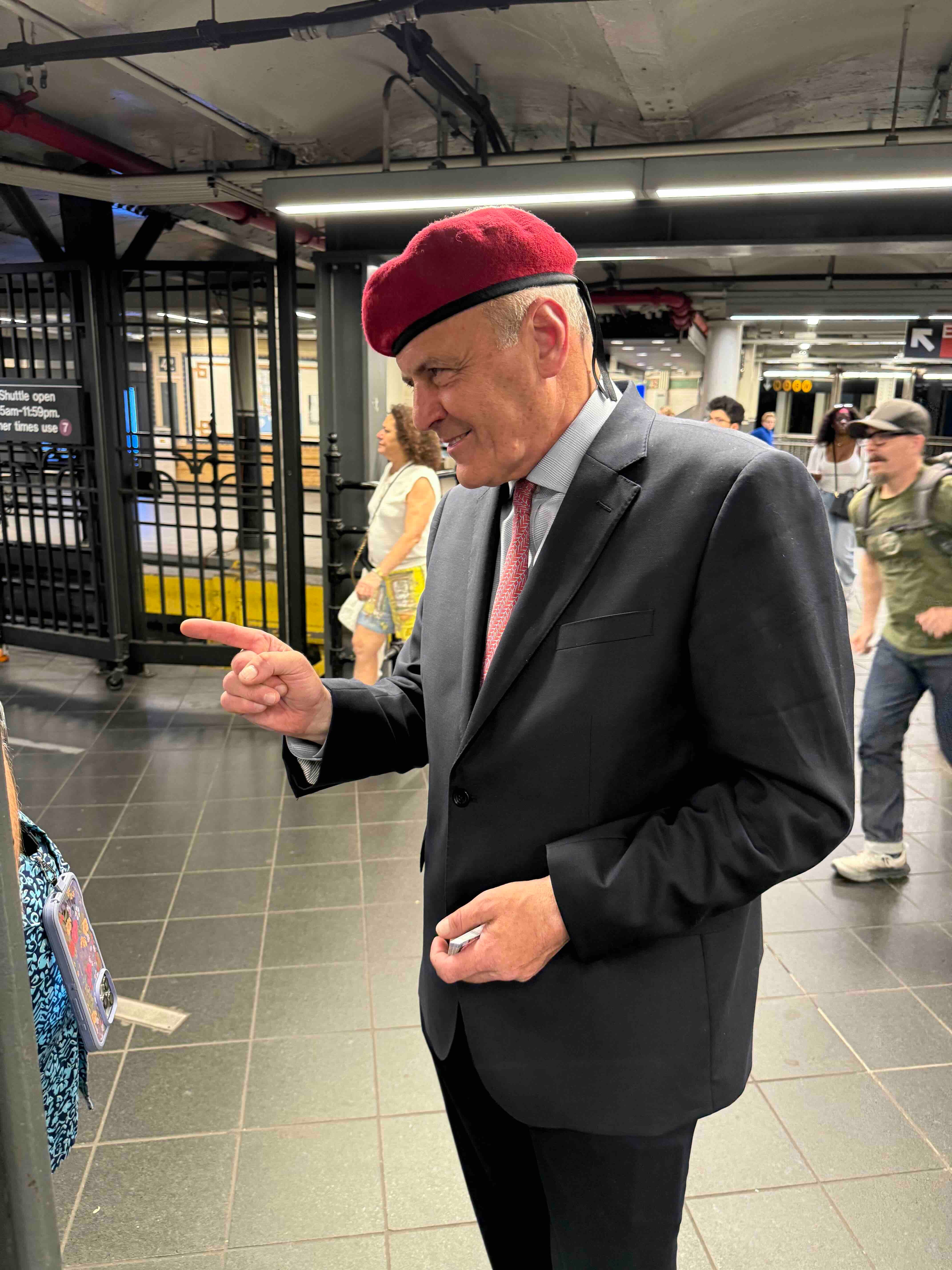 And no other reporters show up. So for an hour, in-between passing subway riders and prospective voters who paused for a selfie with the candidate in his Guardian Angel red beret or wished him well, I have what amounts to an exclusive interview with Sliwa.
