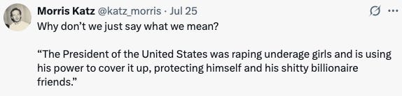 Who is Morris Katz? Katz’s own X account on July 25, 2025, asked, “Why don’t we just say what we mean? “The President of the United States was raping underage girls and is using his power to cover it up, protecting himself and his shitty billionaire friends.”