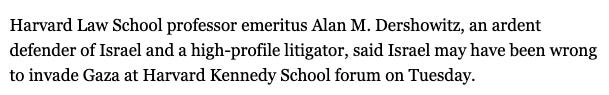 For the Dershowitz, if you want to see what happened, I recommend the YouTube video over the Crimson account, which could have used some more careful editing and which shows signs of being handled by someone whose first language does not include definite articles: