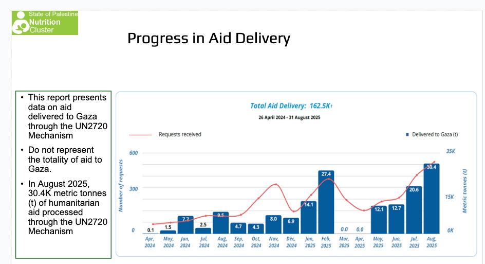 Yet the same source—the “State of Palestine Nutrition Cluster,” which is basically a front for UNICEF, dominated by Israel’s enemies—tells a different and more encouraging story, one the Times is withholding from readers. (The Times text concedes that “more aid has gone into Gaza,” but that story is missing from the massive graphics that appear alongside the text.) Here’s a chart from a September 9, 2025 presentation by the State of Palestine Nutrition Cluster showing the dramatic rise in aid flowing into Gaza via UN mechanisms.