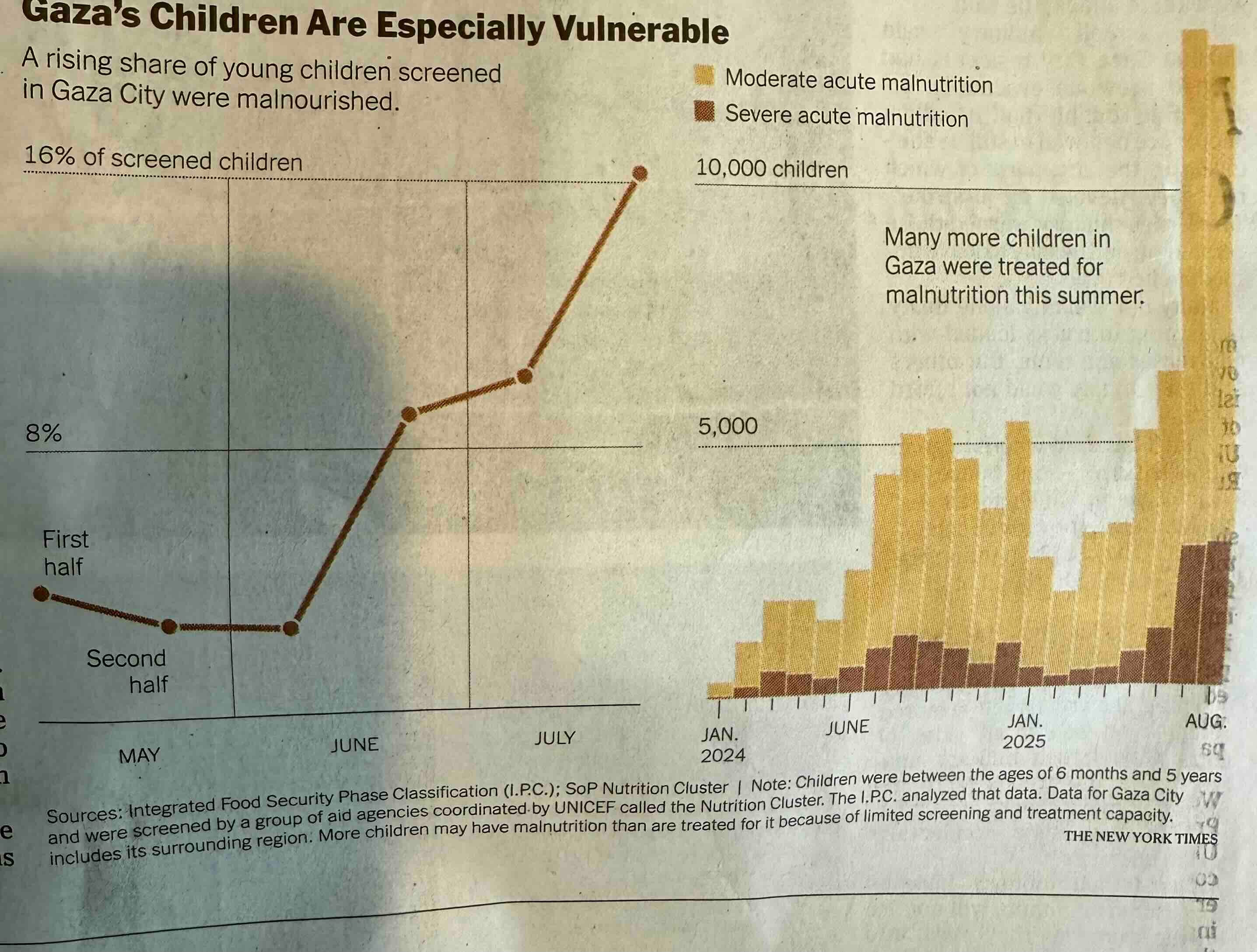 The two Times graphics tell a tale, in numbers, of a worsening “famine” (“In Wartime Gaza, Children Fight to Survive Famine,” is the Times online headline)—sharply rising malnutrition.