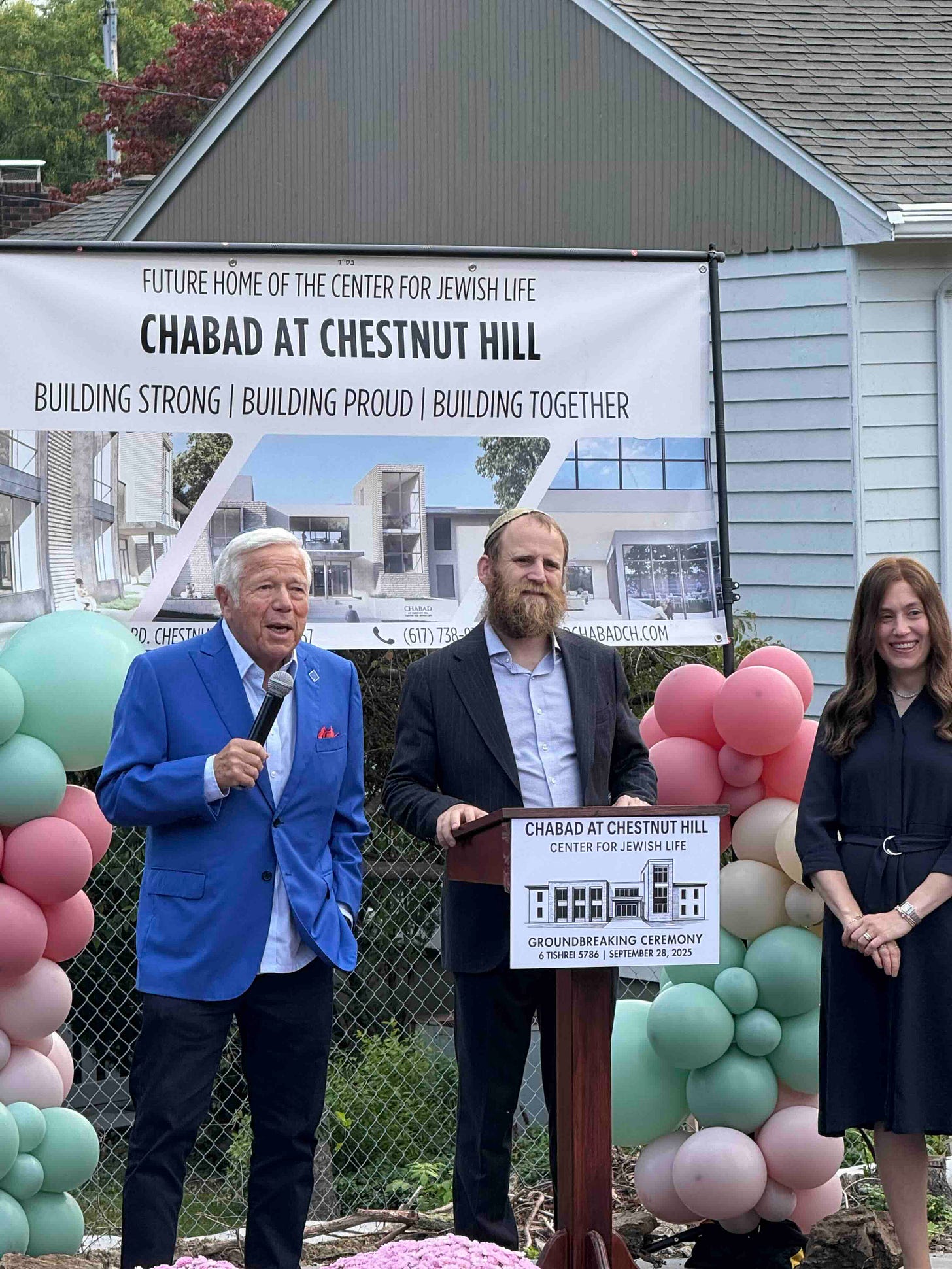 This morning I stopped by a groundbreaking for a new $22 million, 20,000-square-foot building for Chabad at Chestnut Hill, a neighborhood that straddles Newton and Brookline, adjacent to Boston. Speakers at the event—including Rabbi Mendy Uminer and his wife Grunie, and New England Patriots owner Robert Kraft—stressed how the warmth, pride, and joy of this community counter the evil, anger, and hate. Rabbi Uminer noted that when he and Grunie arrived 25 years ago they had one child; now they have ten. The community has grown along with the family.