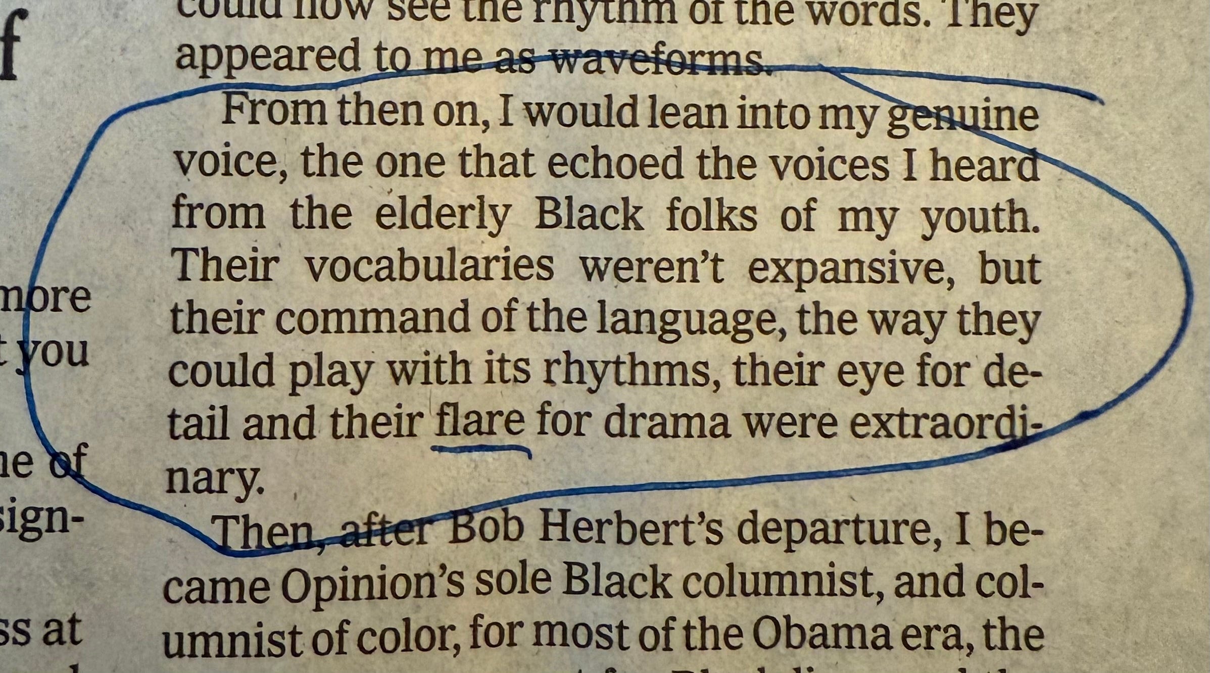 Someone seems to have caught and fixed that online post-publication, but it was ironic that in a passage about command of language the word flair was misspelled. We certainly are not perfect here at The Editors but neither do we have the editorial resources of The New York Times.