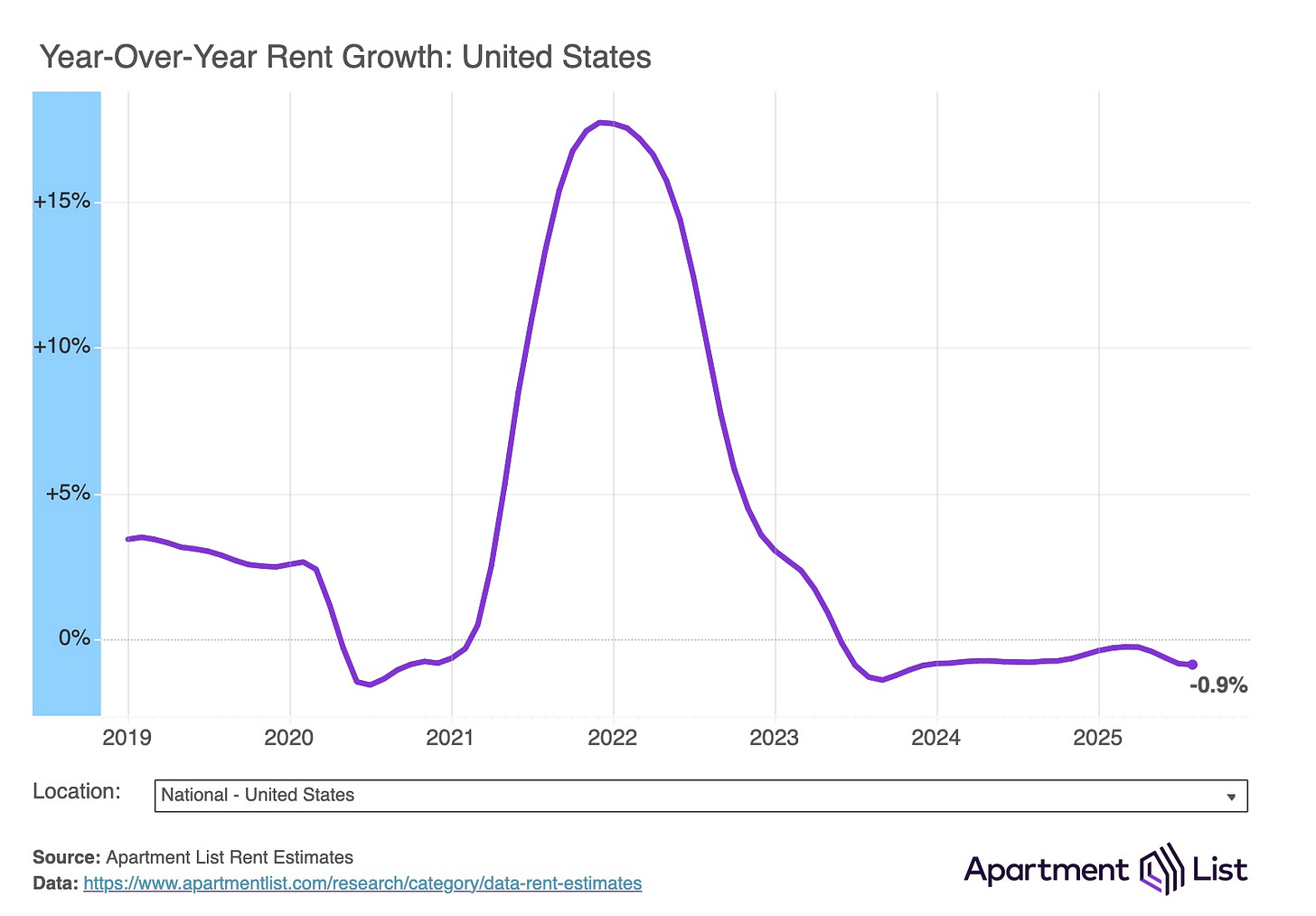 The government is scheduled Friday morning August 29 to release its personal consumption expenditures price index data for the month of July. But in a sign of how private data providers are faster and sometimes more accurate than the government, there’s already private data available for the month of August—and it shows “The national median rent dipped by 0.2% in August…Rent prices nationally are down 0.9% compared to one year ago.”