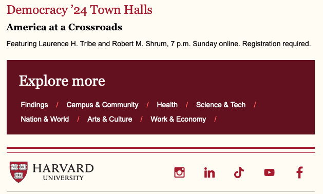 Harvard backs Harris: Under the headline “featured events,” the Harvard-central–administration-published Harvard Gazette emails out a link to a “Democracy ’24 town hall” featuring Laurence Tribe and Robert Shrum.