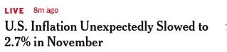 Instead of just reporting the government’s inflation data, the press made the supposedly unexpected nature of the results part of the story. “U.S. Core Inflation Unexpectedly Eases to Slowest Pace Since 2021” was one Bloomberg headline I saw yesterday morning. “Wall Street Gets Relief Rally After CPI Surprise,” was another from Bloomberg. The New York Times homepage headlined “U.S. Inflation Unexpectedly Slowed to 2.7% in November.”