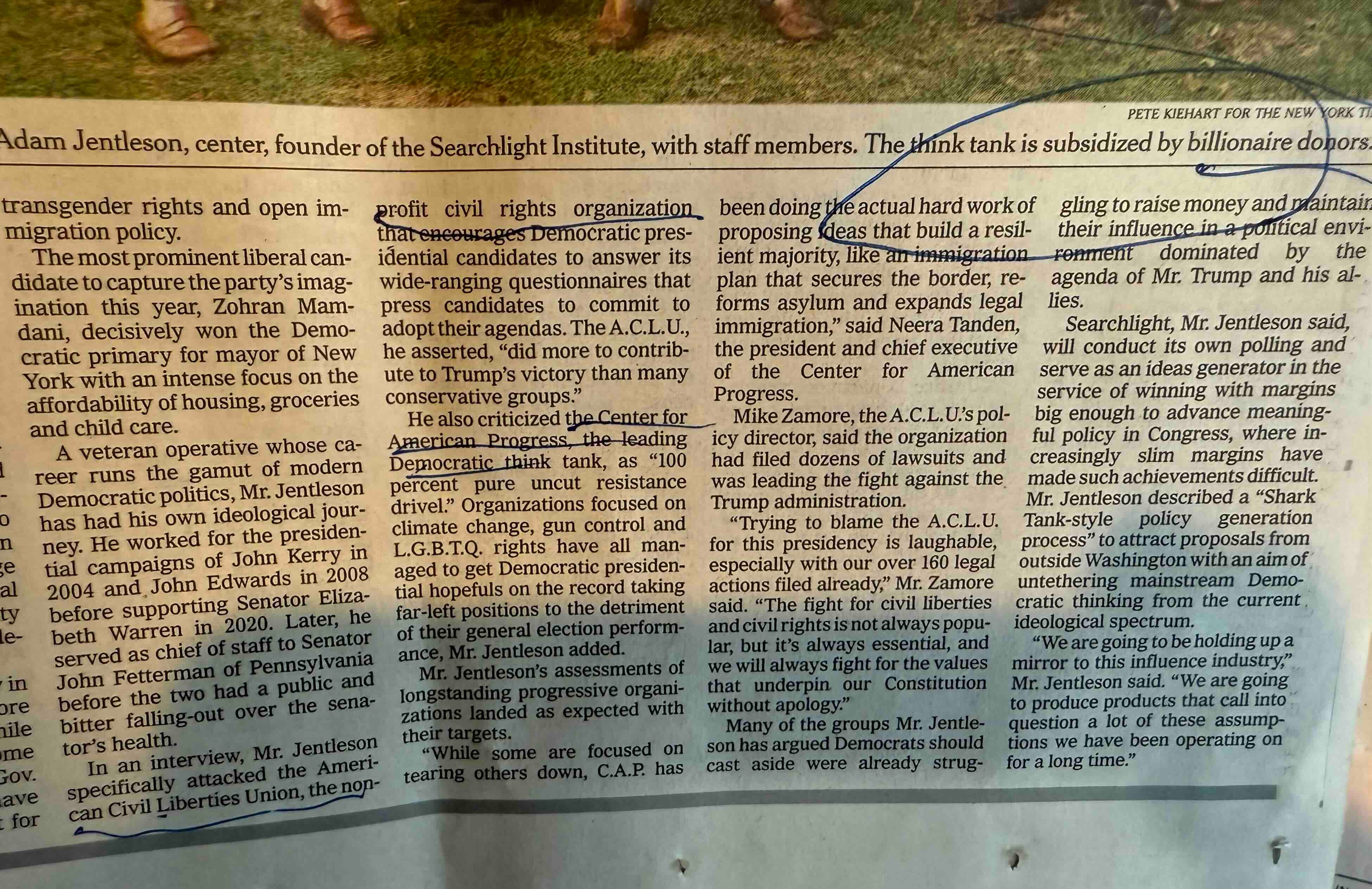 A blatant example of New York Times left-wing bias: The New York Times has a news article about the Searchlight Institute, headlined “New Democratic Institute Aims to Erode Left’s Sway.” The print photo cutline says, “the think tank is subsidized by billionaire donors.” The article says “The organization is subsidized by a roster of billionaire donors highlighted by Stephen Mandel, a hedge fund manager, and Eric Laufer, a real estate investor.”