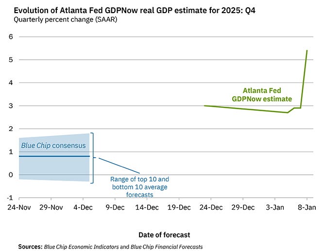 We wrote here December 23, 2025: “Complex systems are hard to predict, but if Bessent is correct and 2025 was setting the table and 2026 is the feast or the banquet, we would not be surprised here to see some quarterly or even annual growth numbers starting with 5 or 6, not 2, 3, or 4. People have forgotten what is possible on the upside.”