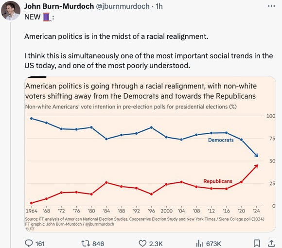 Racial realignment: In the Financial Times, John Burn-Murdoch has a humdinger of a column about how American politics is going through a racial realignment. “Many of America’s non-white voters have long held much more conservative views than their voting patterns would suggest. The migration we’re seeing today is not so much natural Democrats becoming disillusioned but natural Republicans realising they’ve been voting for the wrong party,” he writes.