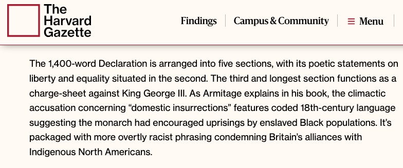 How does describing the Declaration of Independence as “overtly racist” advance Harvard’s “mission”? It’s not even true. The Gazette reference to “more overtly racist phrasing condemning Britain’s alliances with Indigenous North Americans” is an apparent reference to a line in the Declaration that says George III: “has excited domestic insurrections amongst us, and has endeavoured to bring on the inhabitants of our frontiers, the merciless Indian Savages, whose known rule of warfare, is an undistinguished destruction of all ages, sexes and conditions.”