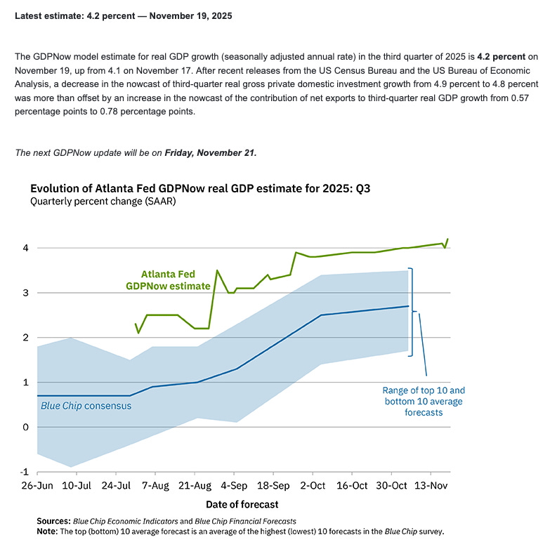 The Federal Reserve Bank of Atlanta’s GDPNow model says the U.S. economy grew at a 4.2 percent real rate in the third quarter of 2025.