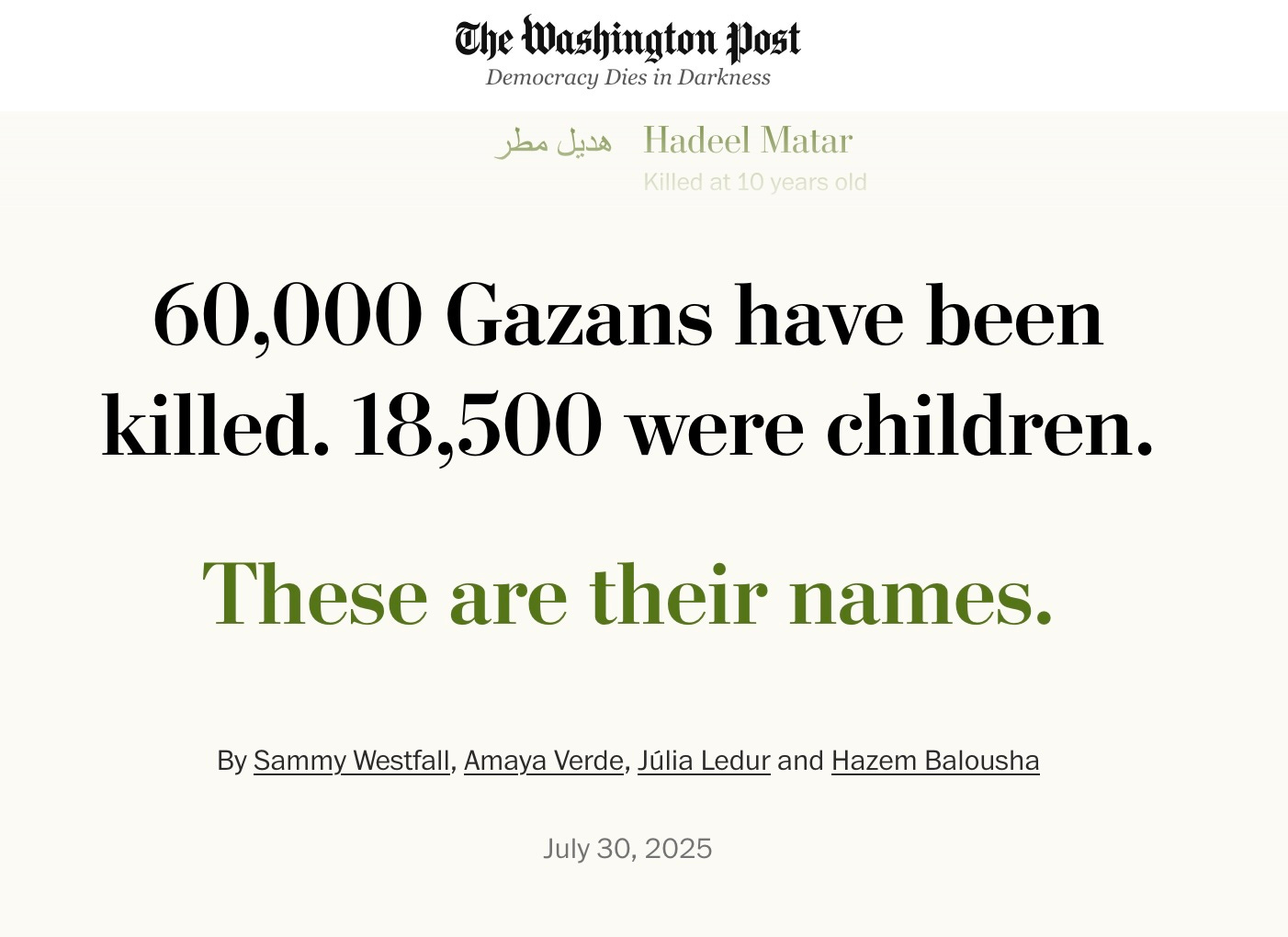 The Washington Post, not affectionately known in pro-Israel circles as Al Jazeera on the Potomac owing to the large number of alumni from the Qatar-owned propaganda outlet staffing the Jeff Bezos-owned newspaper, recently published a list of what it said were 18,500 children among the 60,000 Gazans killed.