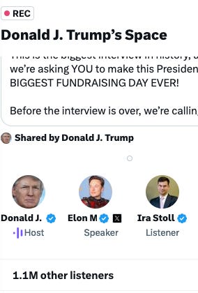 Trump on X: I caught most of President Trump’s appearance with Elon Musk on X. It started off as less of an interview or conversation and more of a Trump campaign infomercial, with Trump going on at extensive length about his key campaign issues—illegal immigration, inflation, “lawfare.” Trump praised Musk’s Tesla cars: “You do make a great product by the way.” Musk praised Trump’s courage under fire in the assassination attack.